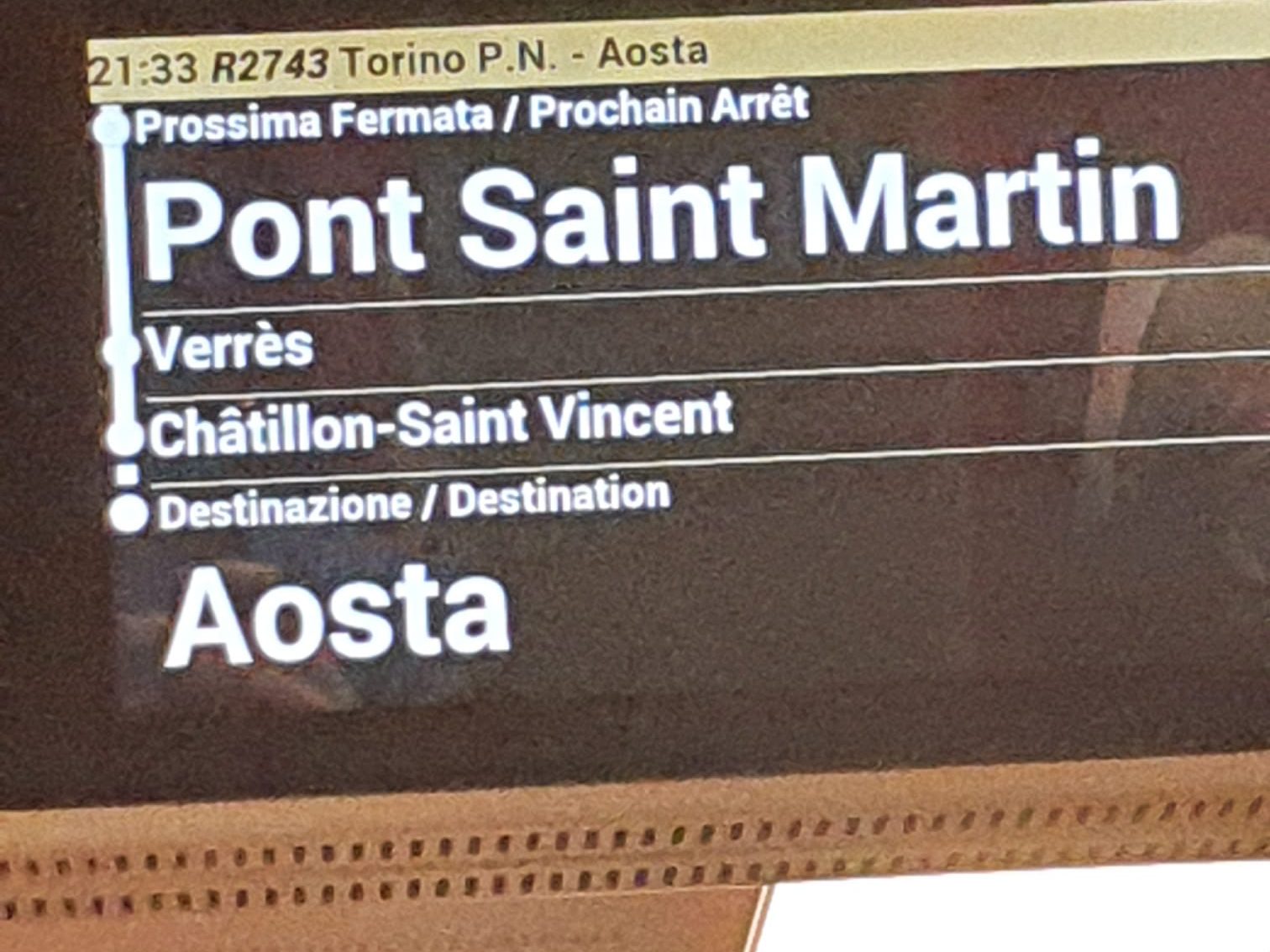 Gare routière d’Aoste : Pont-Saint-Martin écrit sans traits d’union. On remarquera aussi l’absence du français malgré la présence de l’anglais.